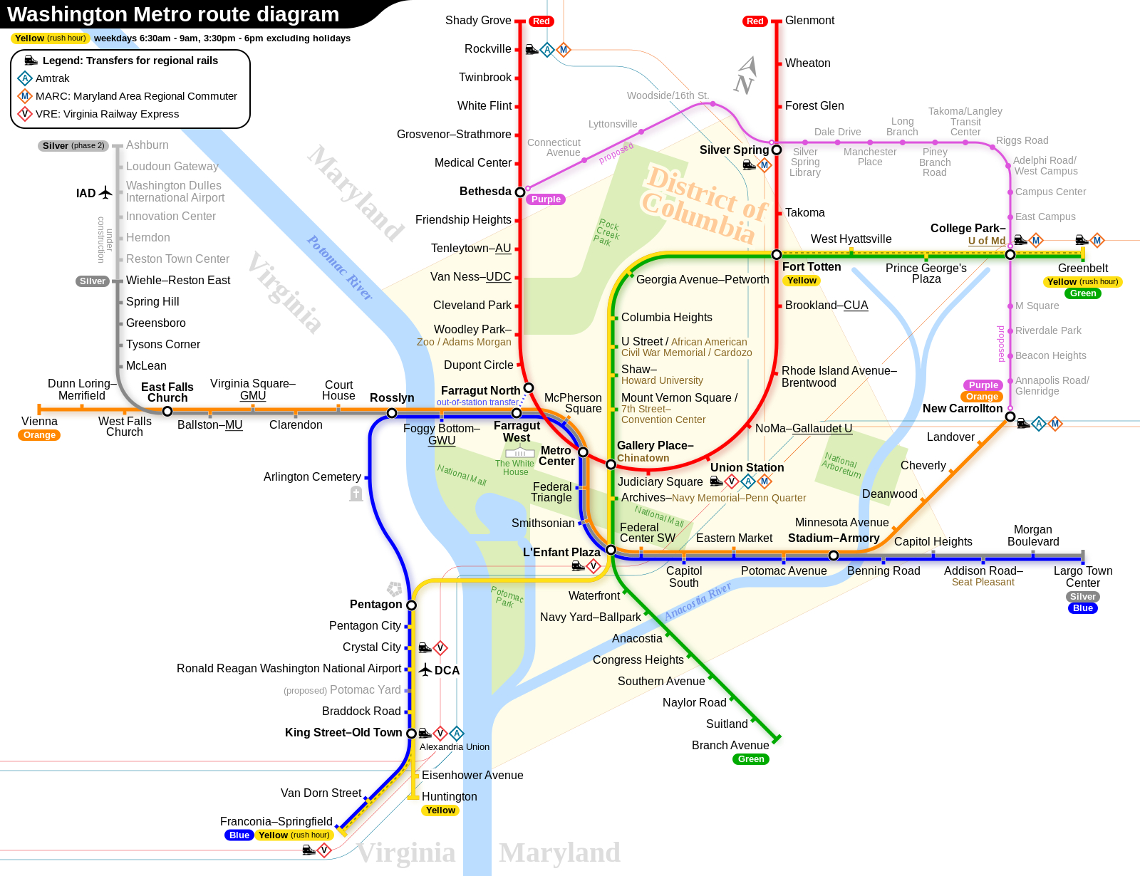 Opened in 1976, the network now includes six lines, 91 stations, and 117 miles (188 km) of route. Due to subway track depths in the swampy area of Washington, Metro’s Wheaton station has the longest, single-tier escalator in the Western Hemisphere, spanning 230 feet (70 m).